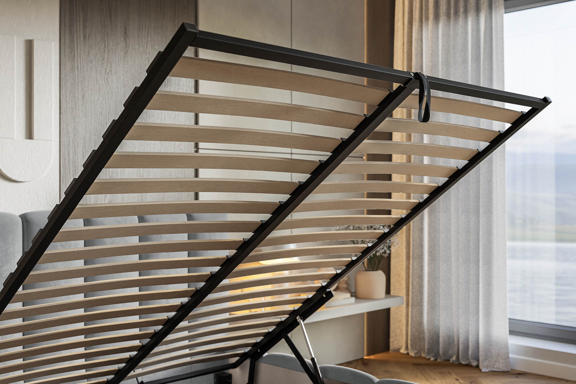 Łóżko ze stelażem i pojemnikiem na pościel