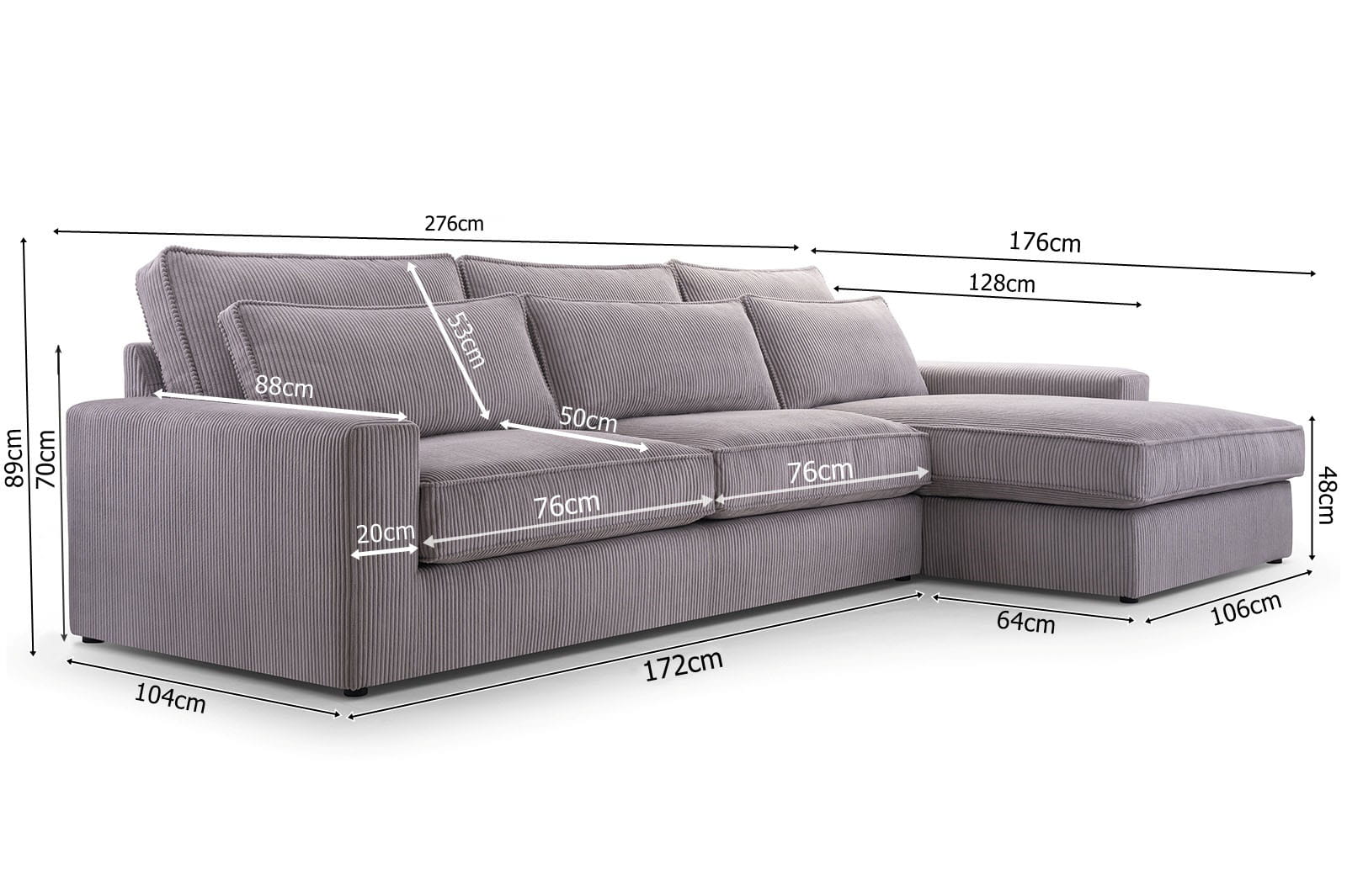 - Wysokość (z poduchami): 89 cm