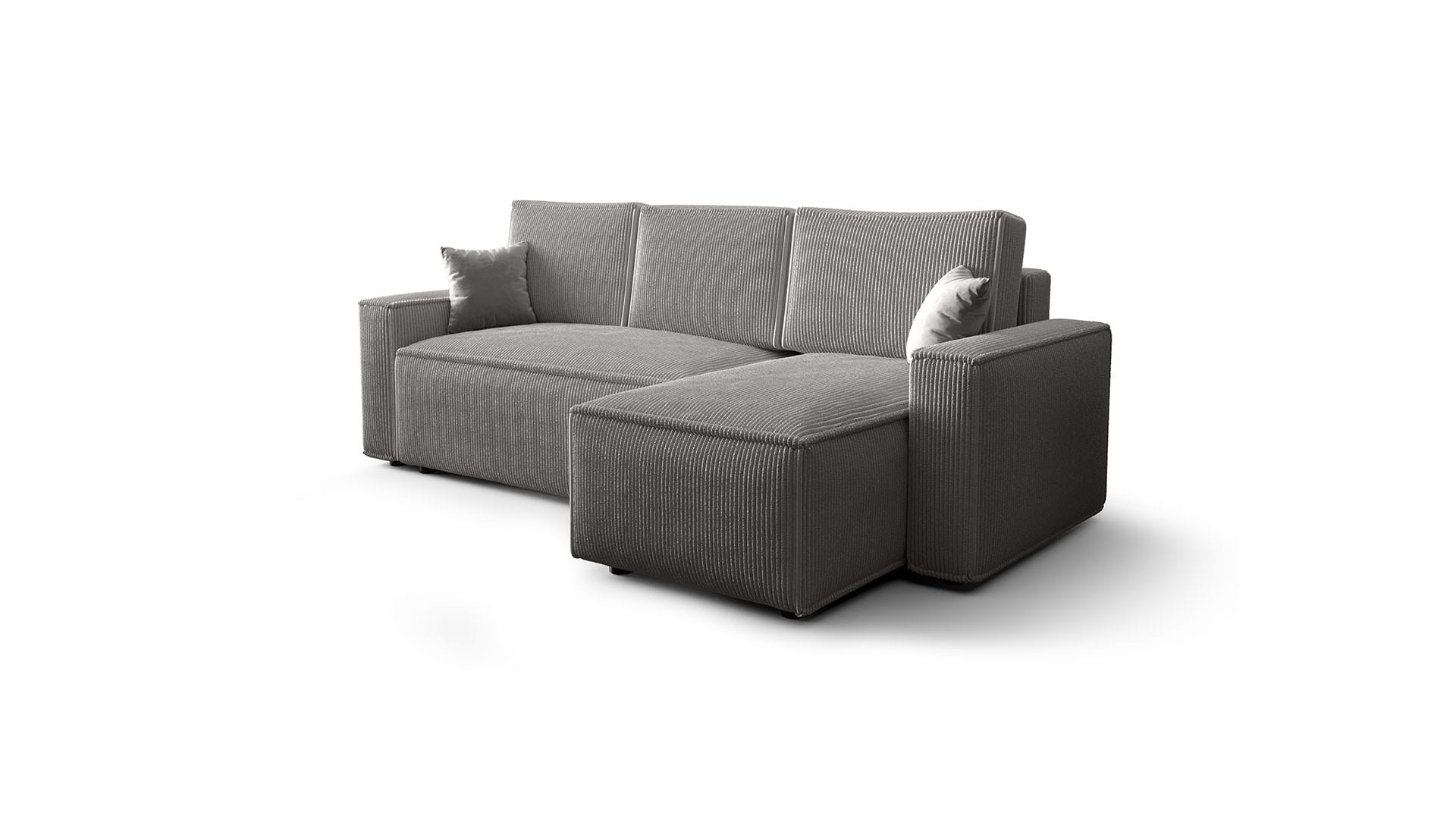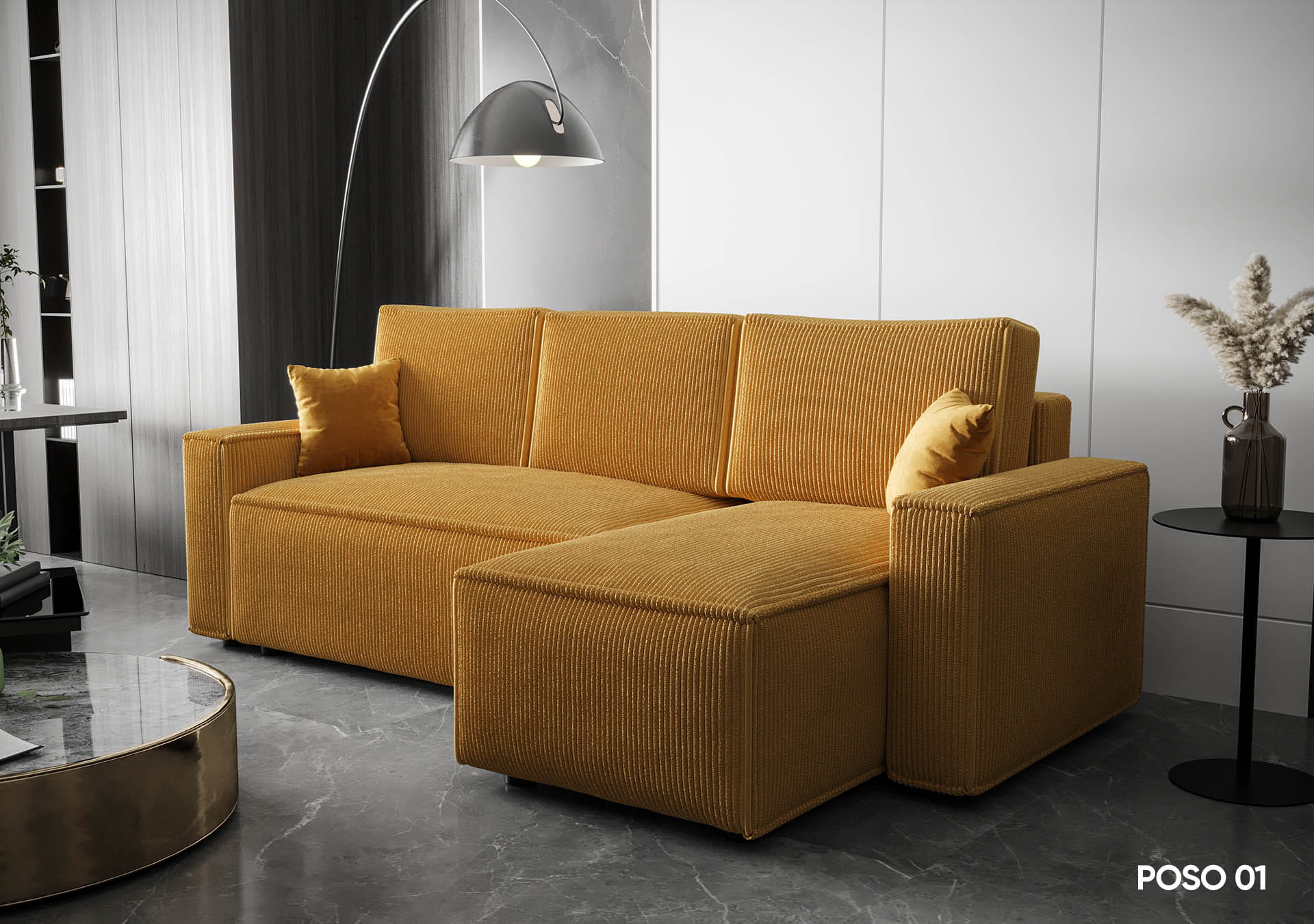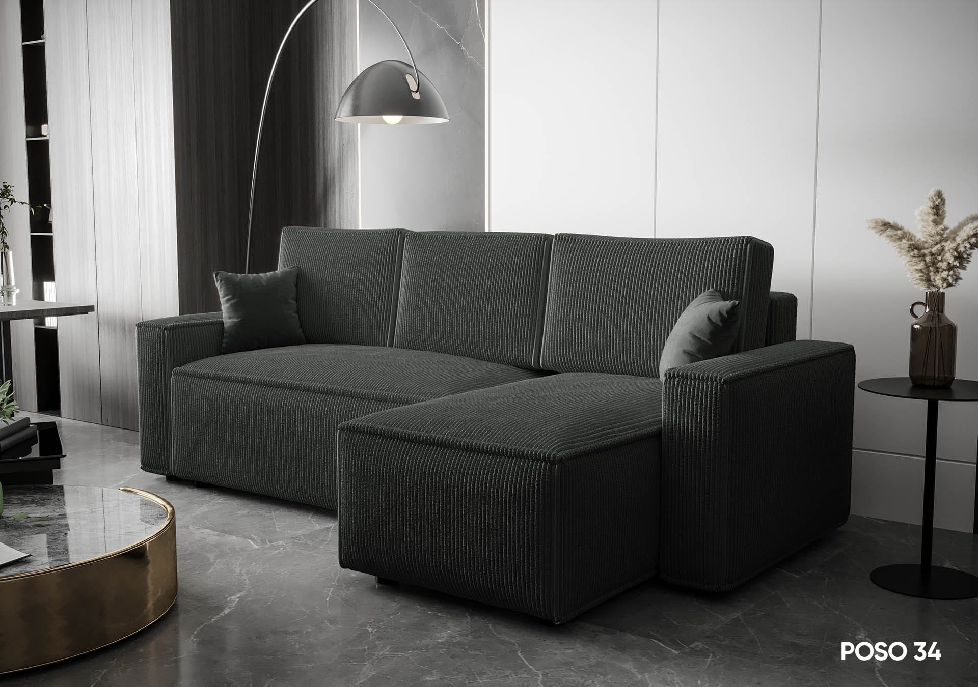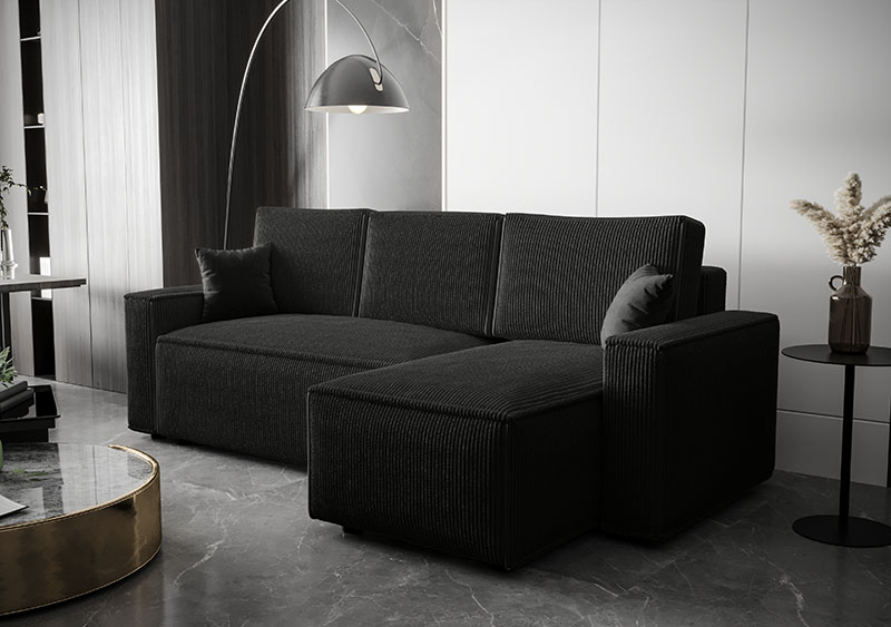Narożnik AMBER idealnie wpisuje się w nowoczesne aranżacje wnętrz. Wyposażony jest w funkcję spania codziennego, co czyni go idealnym rozwiązaniem do mieszkań o ograniczonej przestrzeni. Wyrazista, sztruksowa faktura materiału nadaje narożnikowi unikalnego charakteru, podkreślając jego nowoczesny styl.