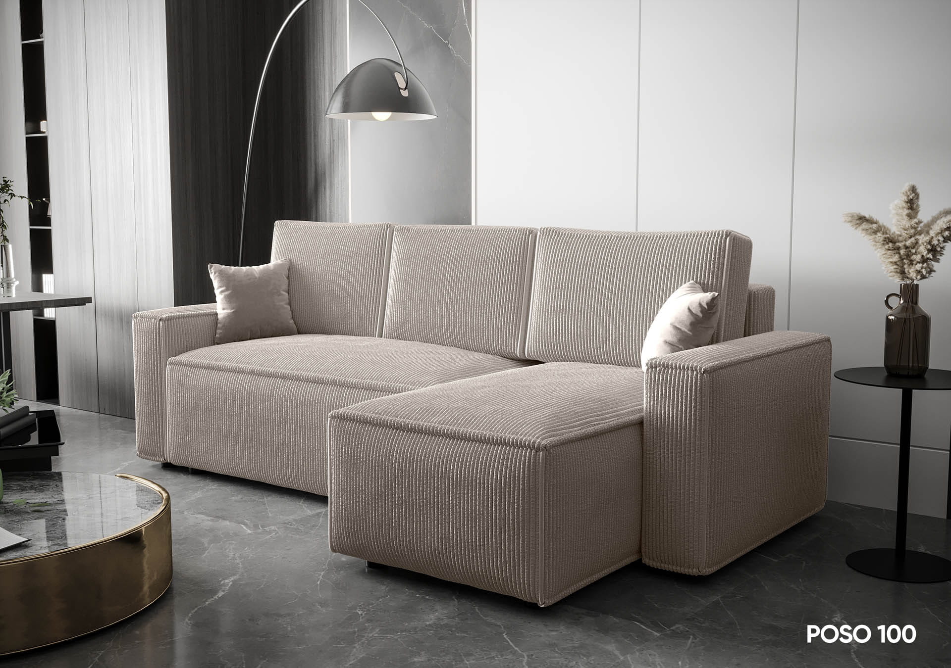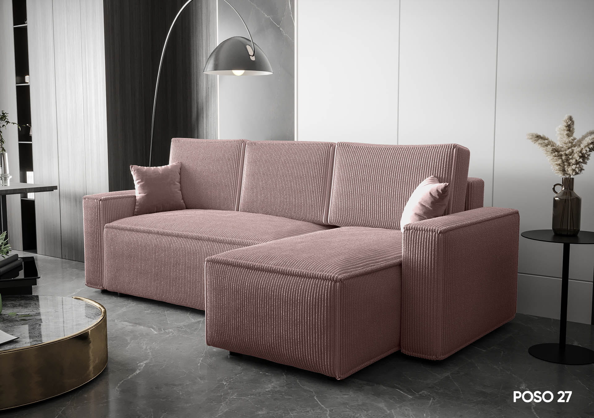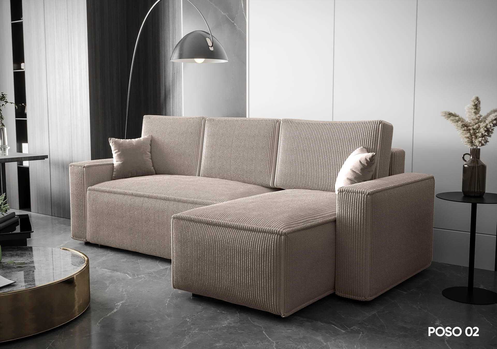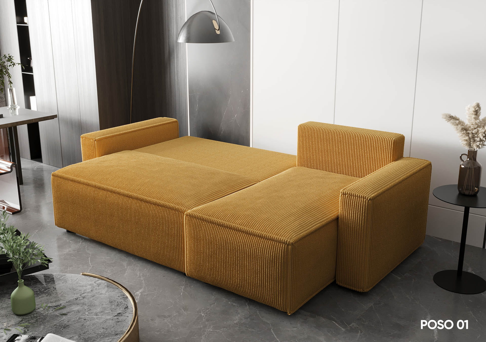 Narożnik AMBER idealnie wpisuje się w nowoczesne aranżacje wnętrz. Wyposażony jest w funkcję spania codziennego, co czyni go idealnym rozwiązaniem do mieszkań o ograniczonej przestrzeni. Wyrazista, sztruksowa faktura materiału nadaje narożnikowi unikalnego charakteru, podkreślając jego nowoczesny styl.