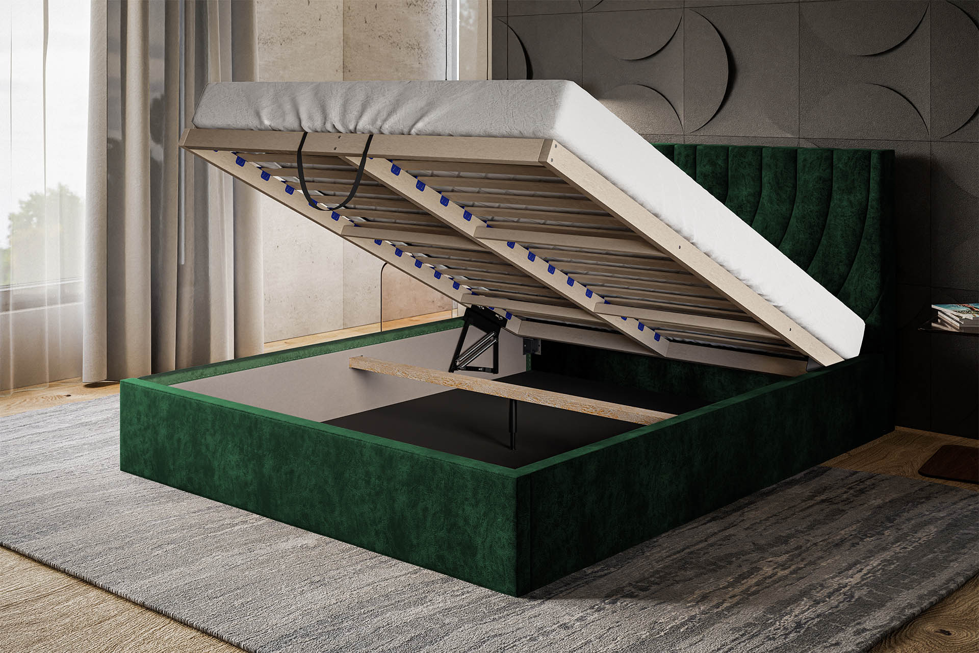 Łóżko tapicerowane BALMO SLIM - 140 cm x 200 cm + pojemnik na pościel + stelaż drewniany
