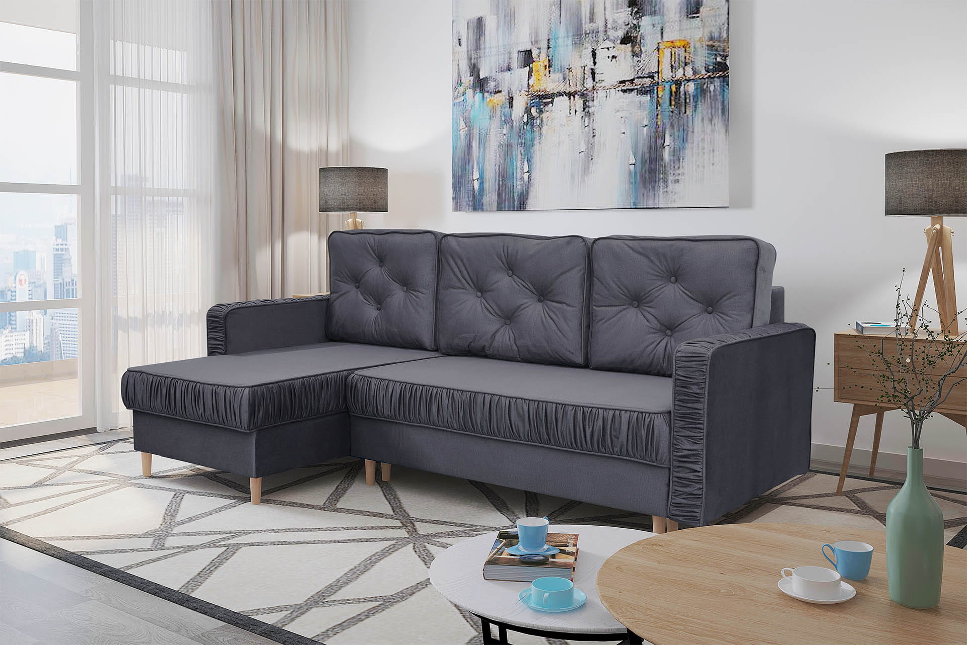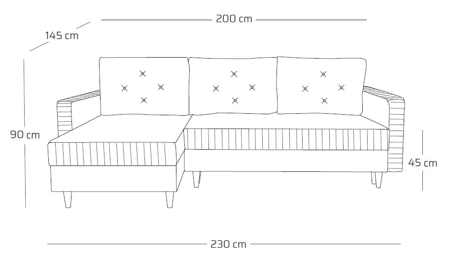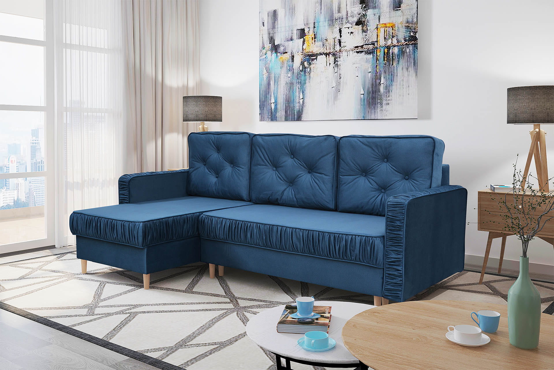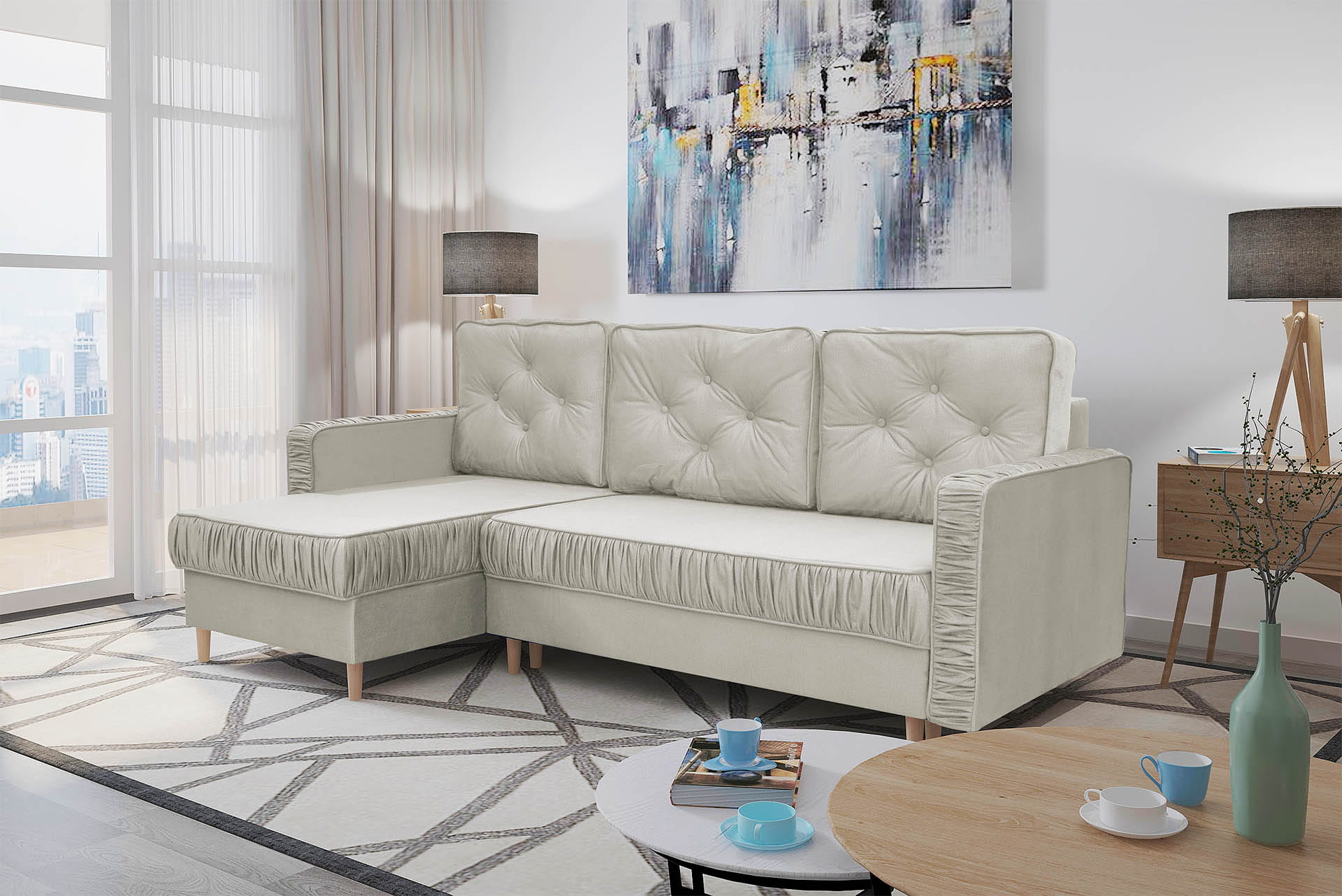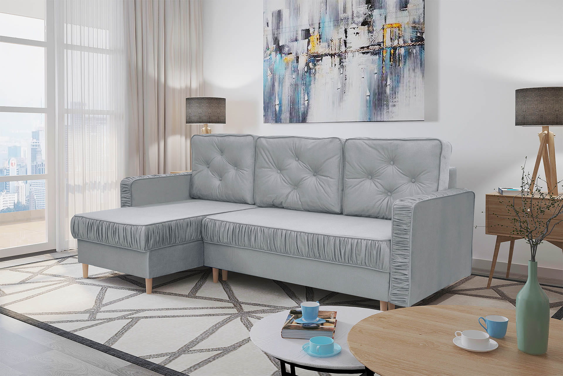 Narożnik PRATO, to propozycja do salonu urządzonego w stylu glamour. Cechą charakterystyczną narożnika PRATO są dekoracyjne marszczenia na brzegach siedziska i podłokietników. Mebel oparty jest na smukłych nóżkach, dodających bryle lekkości przy czym potęgują efekt glamour. Łatwa w obsłudze funkcja spania czyni go praktycznym i na pewno przyda się przy niespodziewanej wizycie gości. Dopełnieniem jest pojemnik na pościel znajdujący się w otomanie - posiadający sprężynowy automat ułatwiający otwieranie. Całość wykonana z niezwykłą dbałością o szczegóły. Dzięki zastosowaniu technologii sprężyn bonell oraz elastycznych pianek uzyskujemy siedzisko o znacznie podwyższonej wytrzymałości i stabilności.