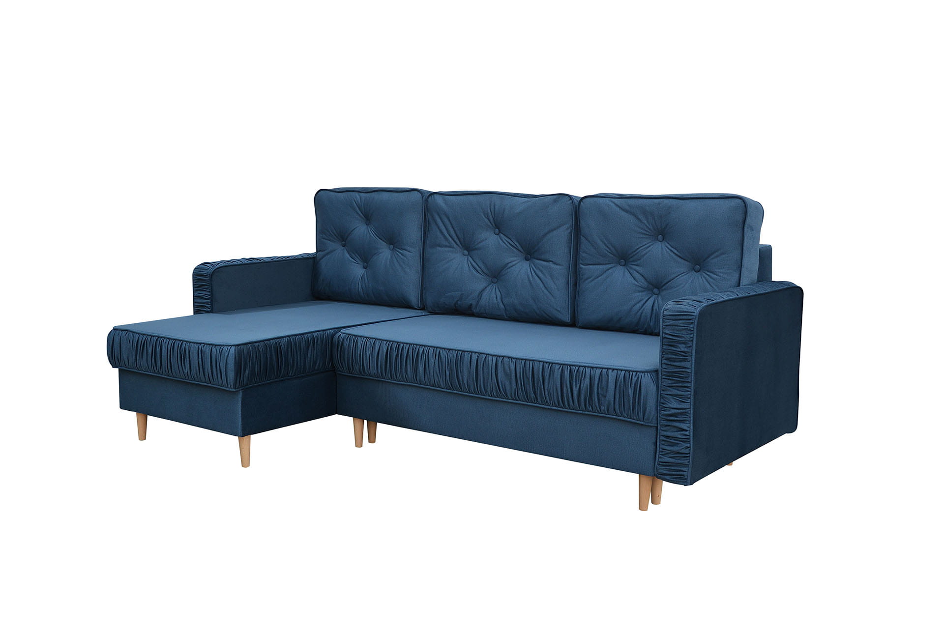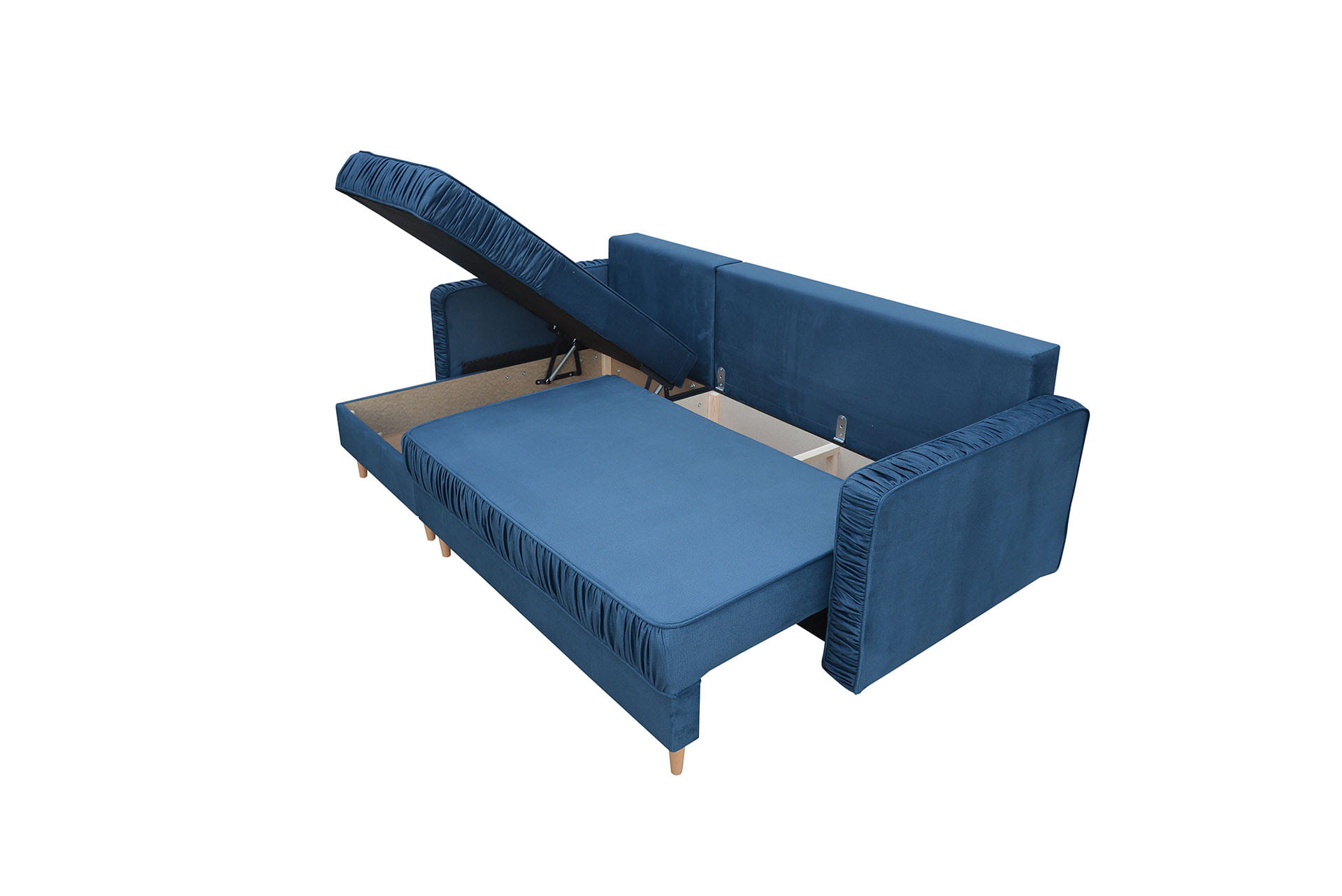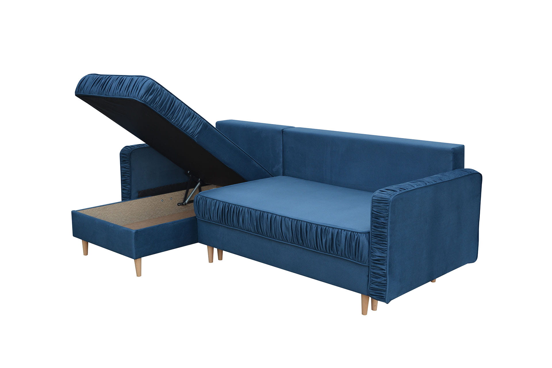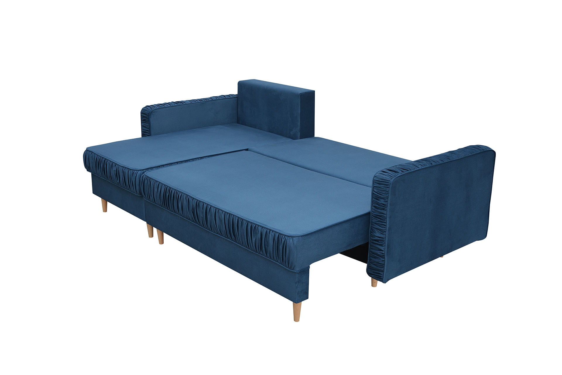 Narożnik PRATO, to propozycja do salonu urządzonego w stylu glamour. Cechą charakterystyczną narożnika PRATO są dekoracyjne marszczenia na brzegach siedziska i podłokietników. Mebel oparty jest na smukłych nóżkach, dodających bryle lekkości przy czym potęgują efekt glamour. Łatwa w obsłudze funkcja spania czyni go praktycznym i na pewno przyda się przy niespodziewanej wizycie gości. Dopełnieniem jest pojemnik na pościel znajdujący się w otomanie - posiadający sprężynowy automat ułatwiający otwieranie. Całość wykonana z niezwykłą dbałością o szczegóły. Dzięki zastosowaniu technologii sprężyn bonell oraz elastycznych pianek uzyskujemy siedzisko o znacznie podwyższonej wytrzymałości i stabilności.