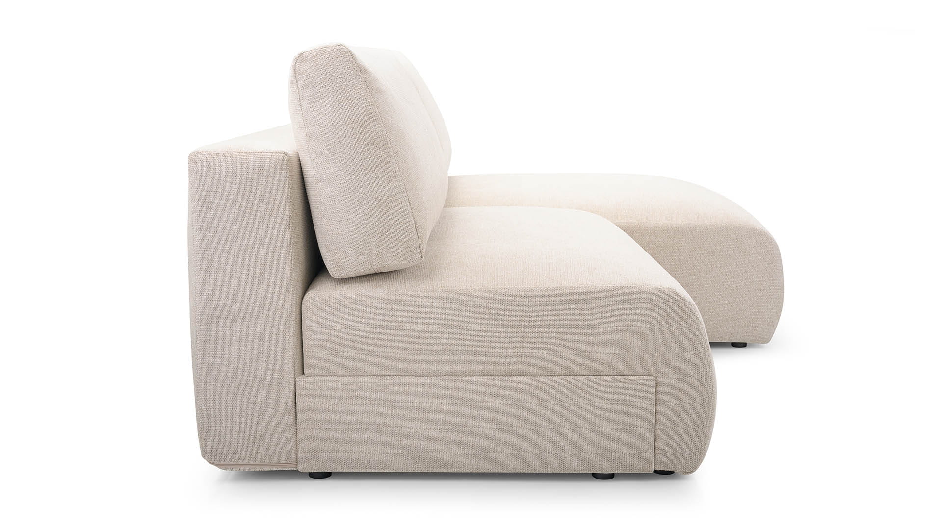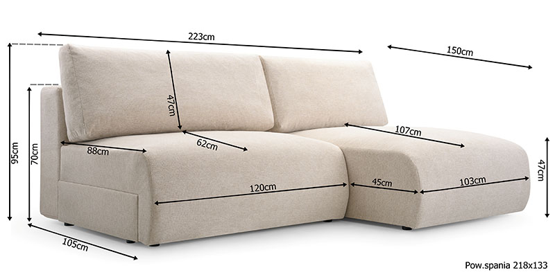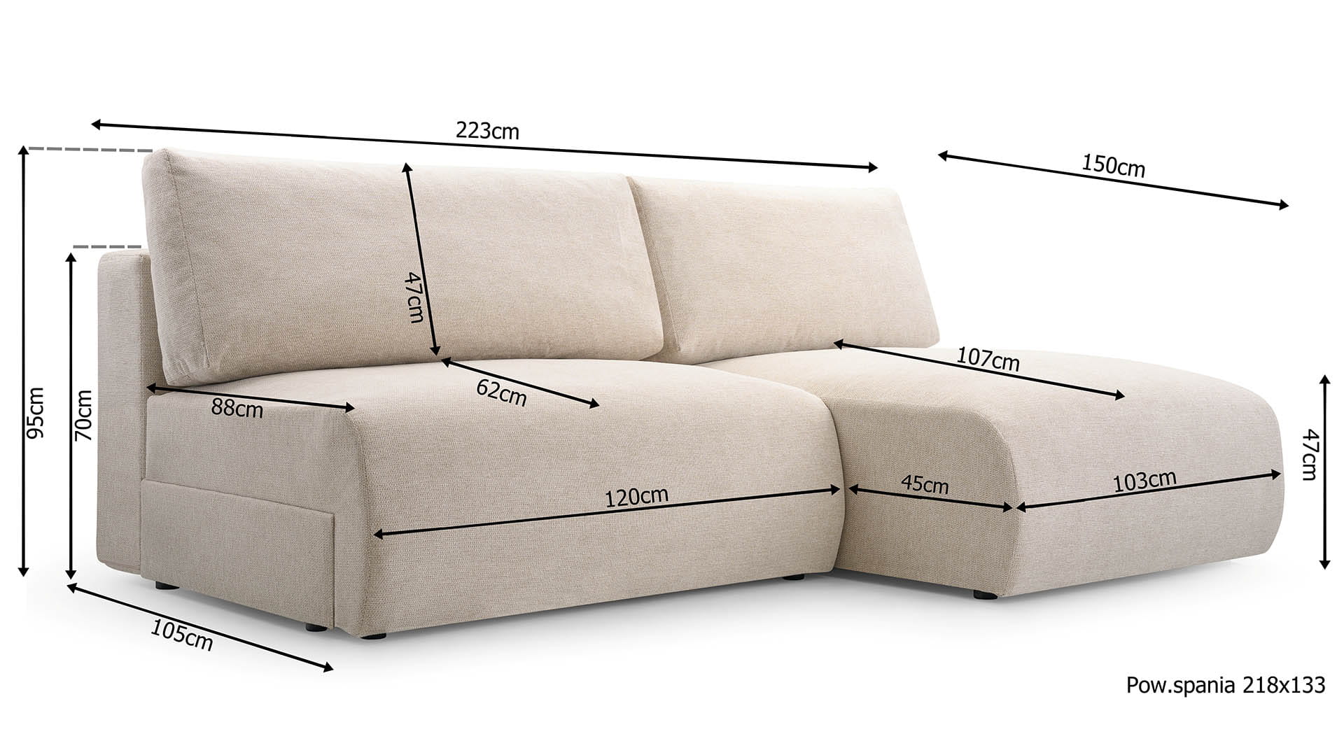 Kompaktowy rozmiar narożnika sprawia, że doskonale pasuje do mniejszych przestrzeni, a funkcja spania z łatwym w obsłudze systemem DL zapewnia wygodę i praktyczność. Dodatkowo, narożnik wyposażony jest w pojemny schowek na pościel, co zwiększa jego funkcjonalność i pomaga w utrzymaniu porządku.