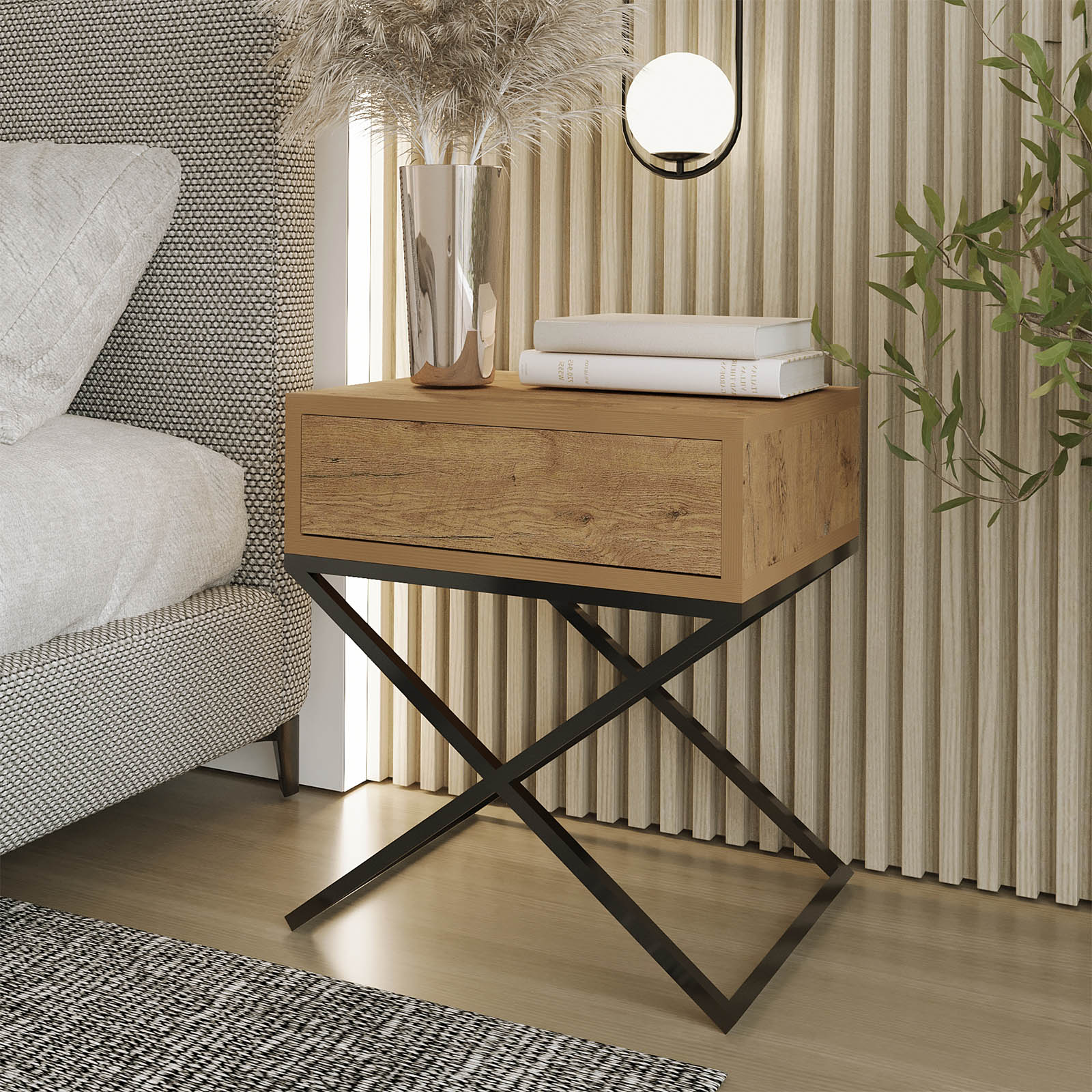 Szafka nocna wykonana z matowej płyty laminowanej, zapewnia elegancki wygląd i długotrwałą wytrzymałość. Posiada praktyczną szufladę, która pozwala na wygodne przechowywanie drobnych przedmiotów. Idealnie wpisuje się w trendy stylu LOFT, łącząc prostotę z funkcjonalnym designem.