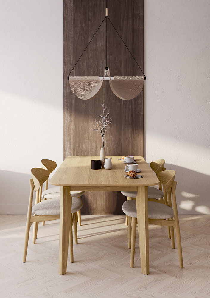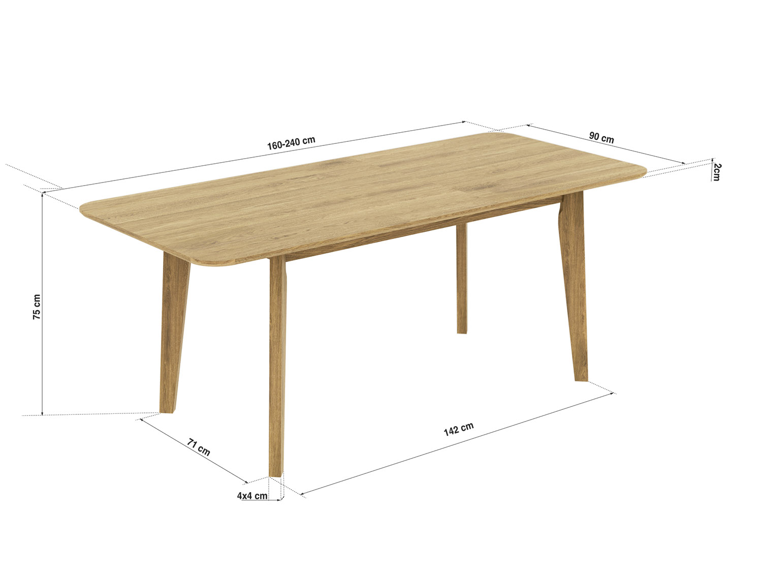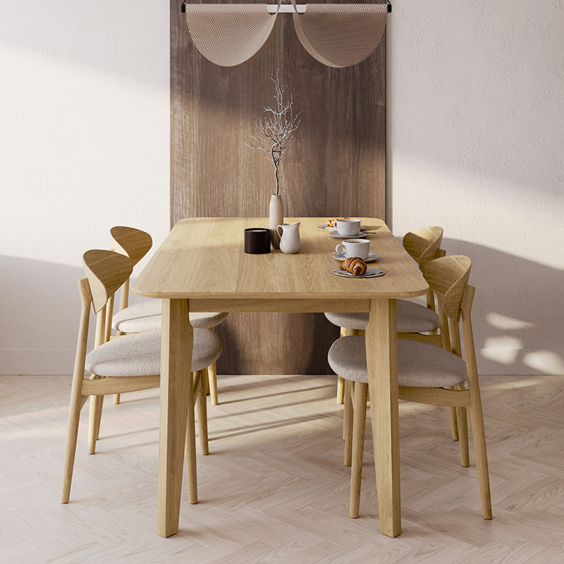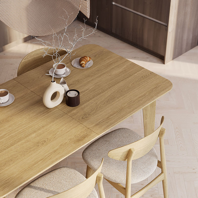 Blat stołu został wykonany z płyty MDF fornirowanej naturalną okleiną dębową, co nadaje mu elegancki i szlachetny wygląd. Nogi wykonane są z litego drewna dębowego - gwarantują trwałość oraz idealne dopasowanie kolorystyczne do blatu. Delikatnie zaokrąglone krawędzie dodają całości lekkości, a staranne wykończenie podkreśla naturalne piękno drewna.