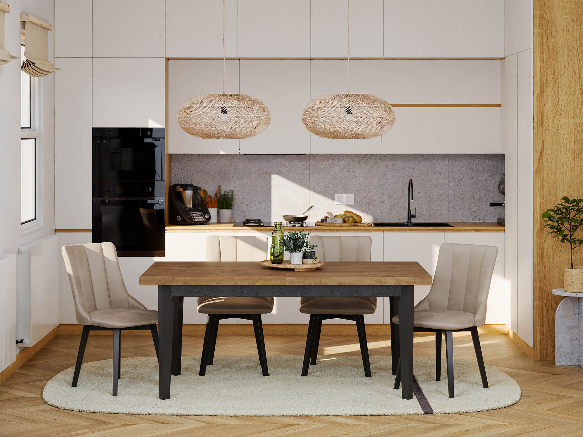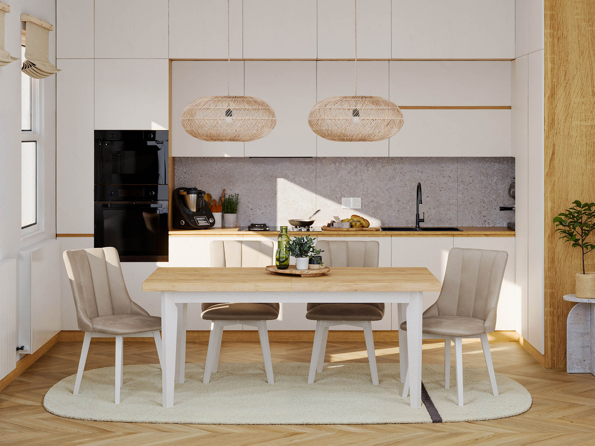 Rozkładany stół na nogach z drewna bukowego i blatem z płyty laminowanej. Takie połączenie tworzy solidny i stylowy stół do kuchni lub jadalni.