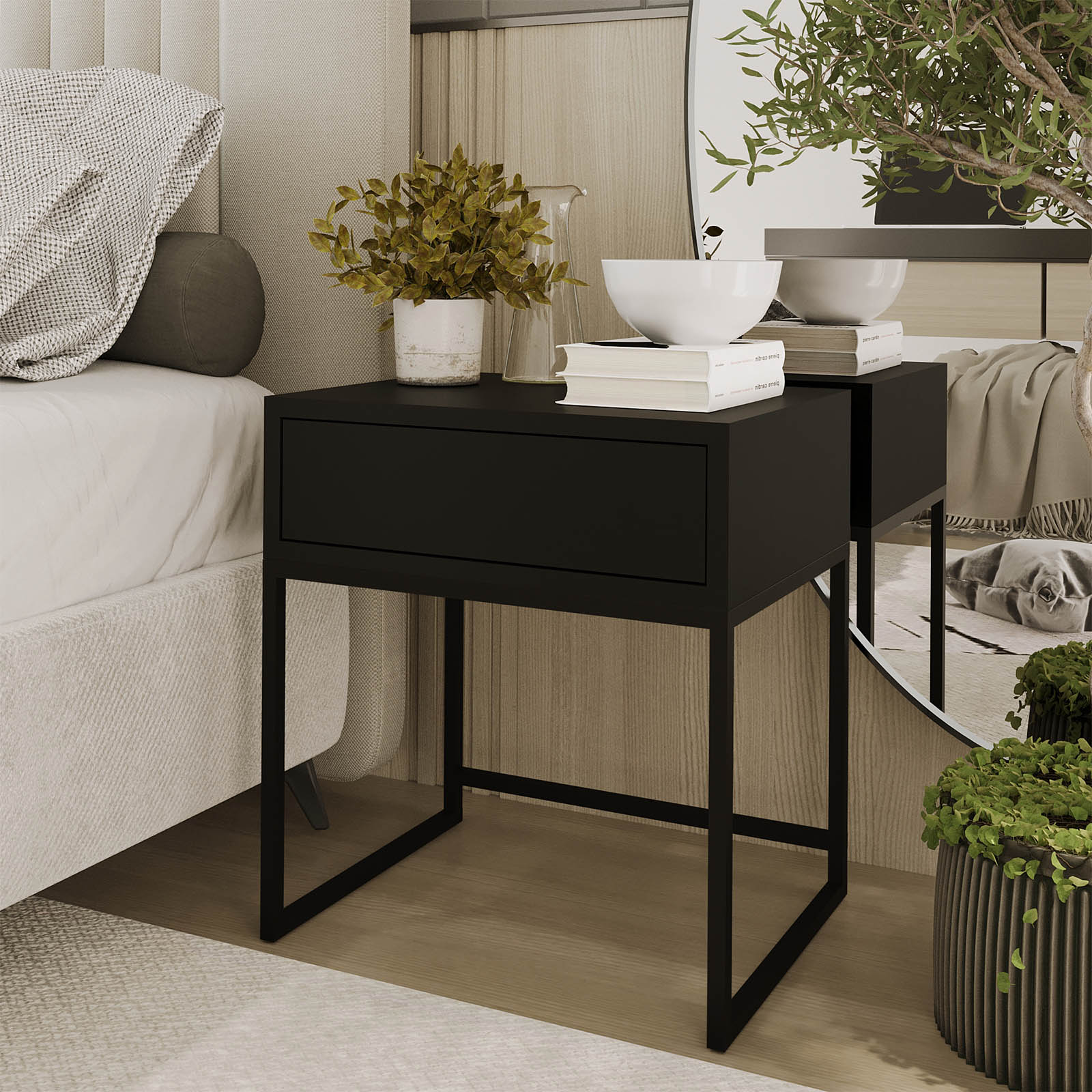 Szafka nocna wykonana z matowej płyty laminowanej, zapewnia elegancki wygląd i długotrwałą wytrzymałość. Posiada praktyczną szufladę, która pozwala na wygodne przechowywanie drobnych przedmiotów. Idealnie wpisuje się w trendy stylu LOFT, łącząc prostotę z funkcjonalnym designem.