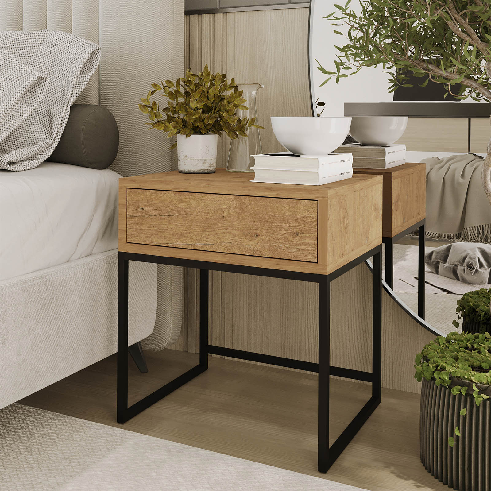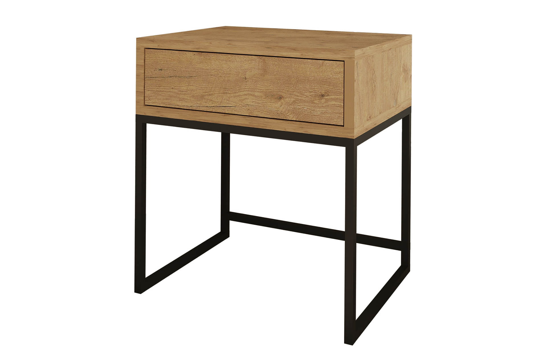 Szafka nocna wykonana z matowej płyty laminowanej, zapewnia elegancki wygląd i długotrwałą wytrzymałość. Posiada praktyczną szufladę, która pozwala na wygodne przechowywanie drobnych przedmiotów. Idealnie wpisuje się w trendy stylu LOFT, łącząc prostotę z funkcjonalnym designem.